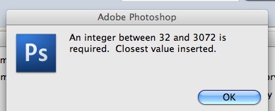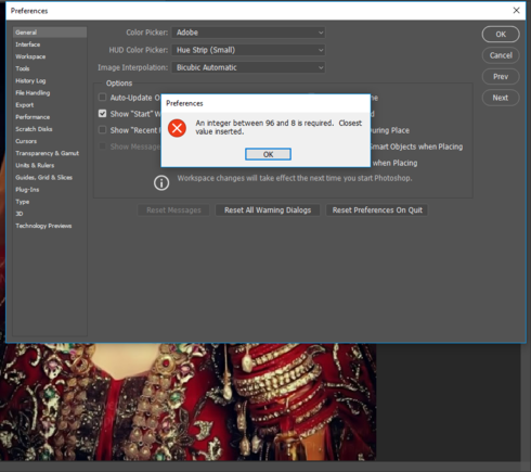 photoshop error an integer between 96 and 8 is required closest value inserted how to solve