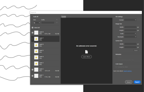 to export photoshop files many errors
